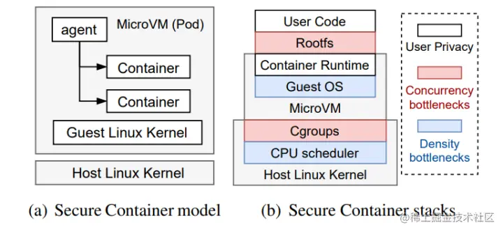 图1(b)显示了安全容器的软件栈层次结构。一般情况下,MicroVM 中的 guest 操作系统(GuestOS)和 host 上的资源调度都被转交给云提供商负责。rootfs 是一个文件系统,充当用户代码的执行环境。它是由 host 创建的,并传递给 microVM 中的容器运行时。在 host 端,cgroup 用于为安全容器分配资源,CPU 调度器负责管理资源分配。由此可见,安全容器的复杂层次结构必定会带来了复杂、高额的额外开销。