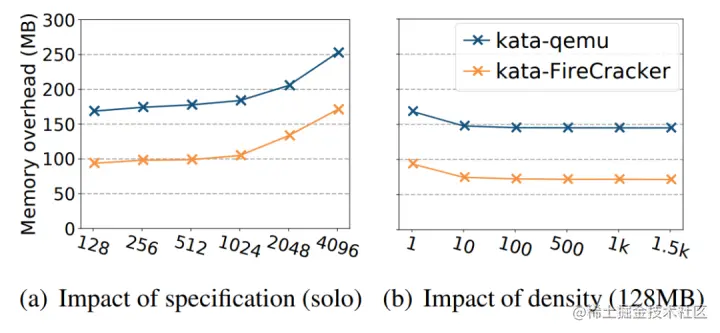 - 当在一个 384GB 内存和 104 个核的节点上部署超过 1000 个 128MB 内存规格的 Kata 容器时,虚拟机的内存占用(guest内核和rootfs)已经占据了大部分内存空间。同时,容器的 I/O 性能也会严重下降。