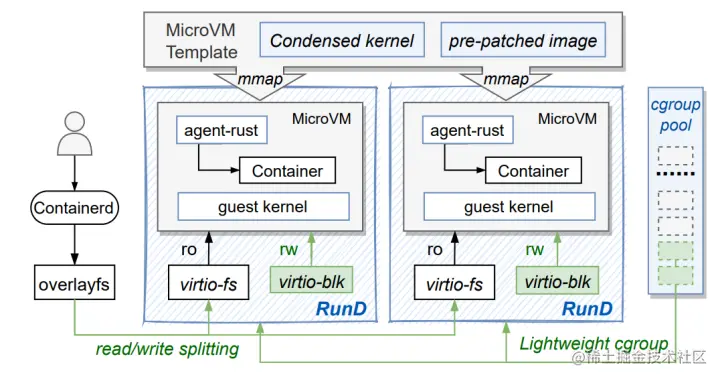 为此我们提出了 RunD — 超轻量级安全容器运行时,通过全栈的 host-to-guest 解决方案以提供高密度部署和高并发能力的支持。RunD 通过引入读写分离的高效文件系统、预补丁和精简的 guest 内核以及一个全局可供维护的 lightweight cgroup 池以解决上述的三个高密高并发挑战。