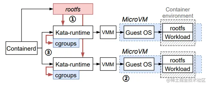 图3/并发启动Kata容器的步骤。并发瓶颈点在于创建rootfs(红色块步骤1)和创建cgroups(红色线步骤3)密度瓶颈点在于MicroVM的高额内存开销(蓝色块步骤2)和大量cgroups的调度维护开销(蓝色块步骤3)