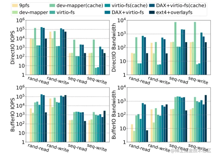 (图4/使用不同rootfs实现的随机和顺序读、写的IOPS和带宽性能)