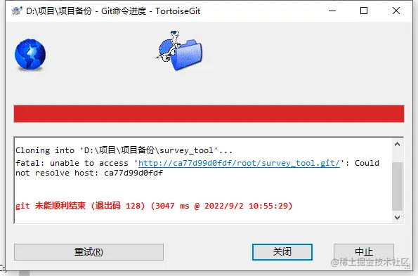 原因没有找到,但是有一个解决办法,就是将链接http://ca77d99d0fdf/root/survey\_tool.git里的ca77d99d0fdf换成当前页面的ip,
