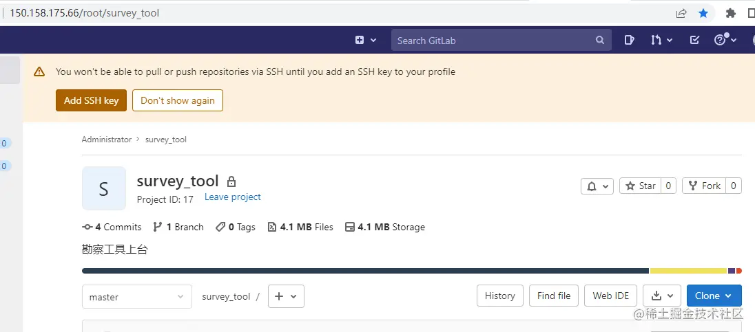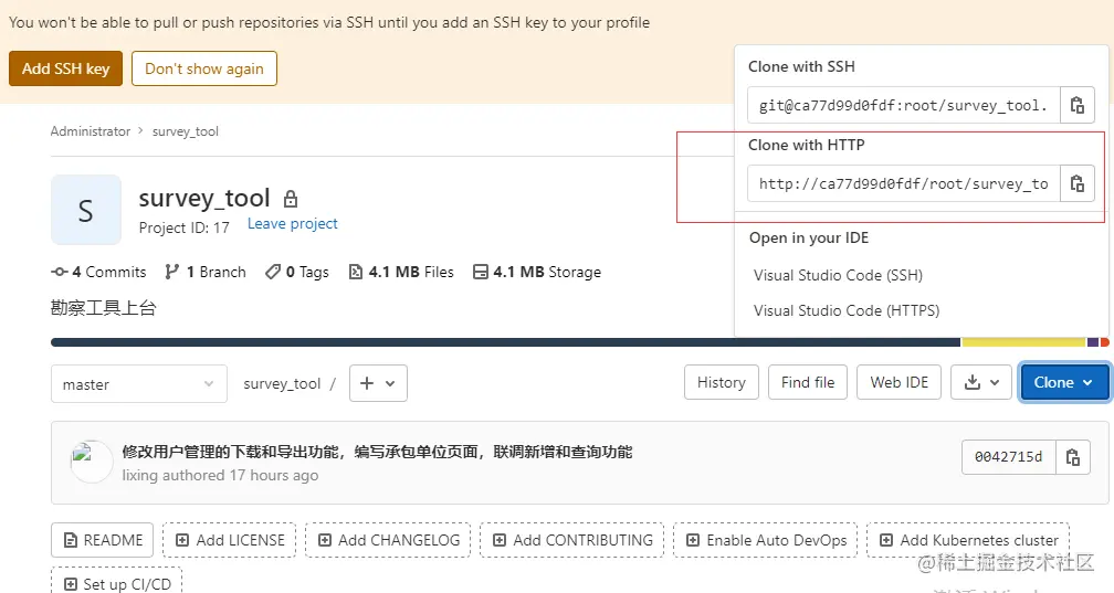 用Clone with HTTP的方式拉取代码,链接为http://ca77d99d0fdf/root/survey\_tool.git
