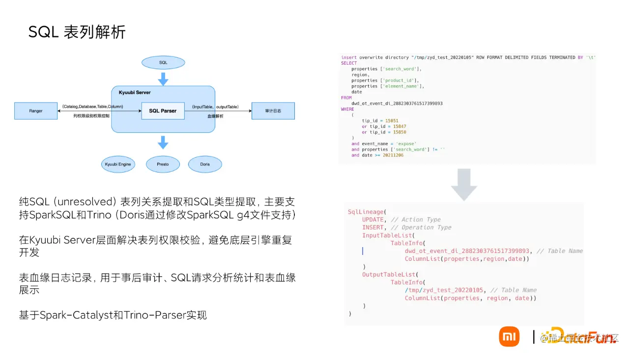 我们在 Kyuubi Server 端做了权限认证,需要获取用户 SQL 的真实表名,单独开发了一个纯 SQL 的解析模块:支持表列血缘关系和 SQL 类型的提取,支持 SparkSQL、Trino 两种语法。