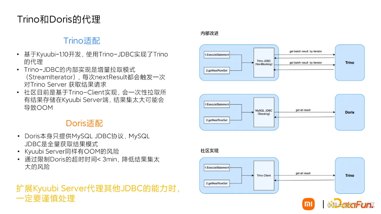 对于 Doris 的适配也采用了 JDBC 的方式,由于 Doris 客户端本身支持 Mysql JDBC,MySQL JDBC 的实现方式是全量拉取模式,Kyuubi Server 端有 OOM 的风险。目前通过限制 Doris 查询的超时时间来降低大结果集导致 OOM 的风险。