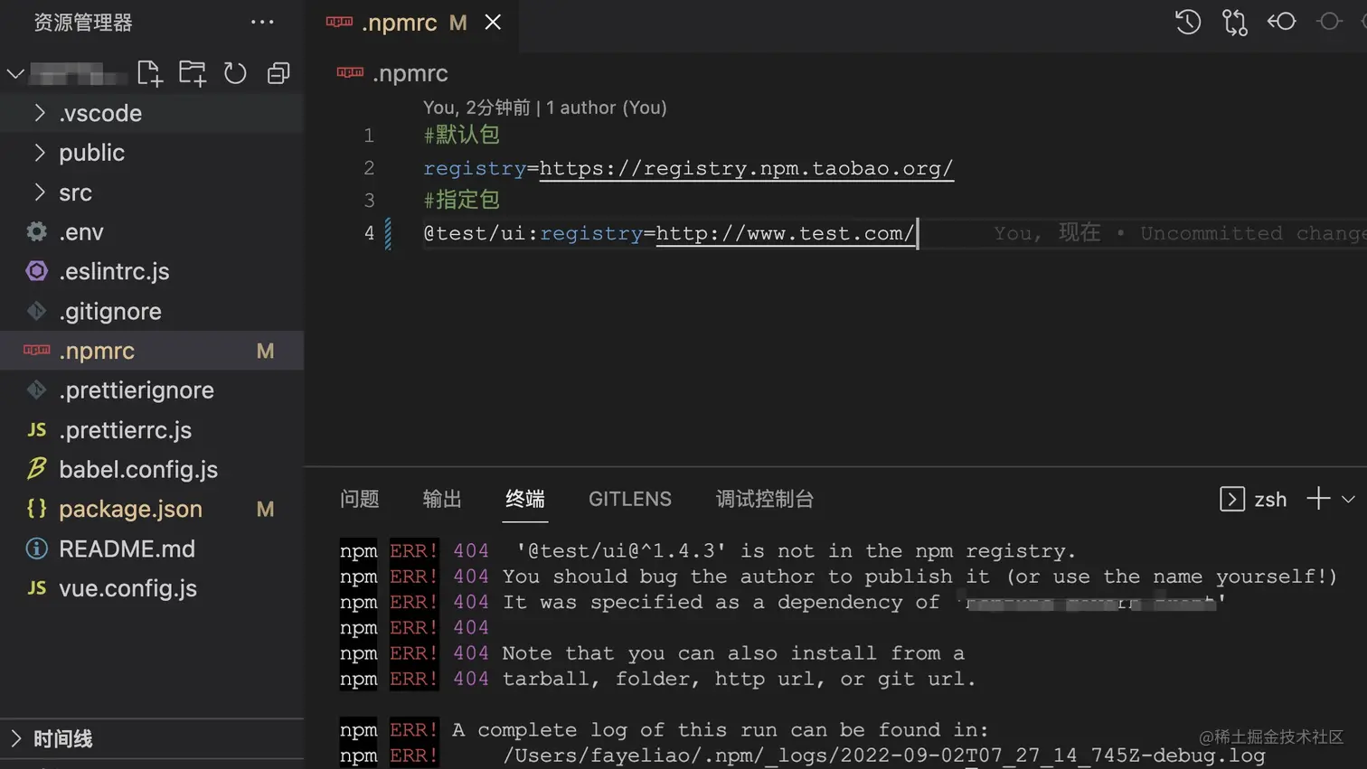 #指定包 - 错误方式@test/ui:registry=http://www.私服地址.com