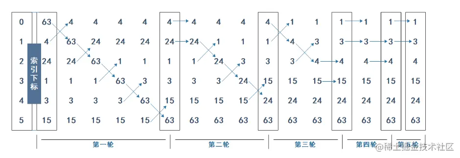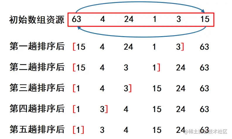 类似气泡上涌的动作,会将数据在数组中从大到小不断的向前移动
