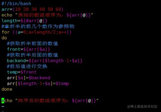 把数组最后一个元素与第一个元素替换,倒数第二个元素与第二个元素替换,以此类推,直到把所有数组元素反转替换。