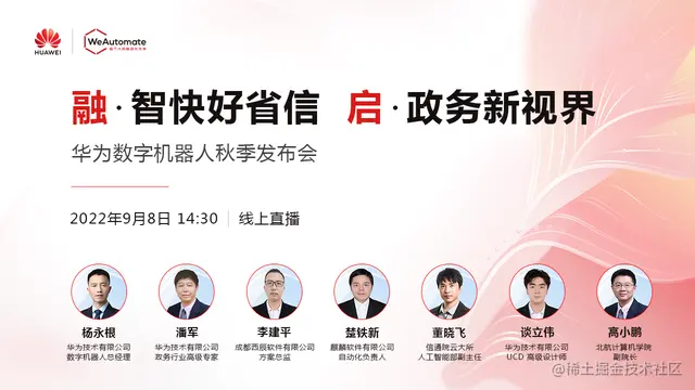 按官方信息公布,“融.智快好省信,启.政务新视界”2022年华为数字机器人秋季发布会,将于9月8日14:30线上正式开启。