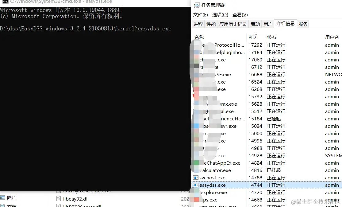 保存之后,在cmd运行easydss.exe,此时可以看到内核已经完全运行起来了。