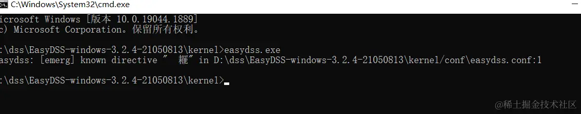 根据用户的问题描述,我们猜测是EasyDSS内核没有启动,于是进入软件kernel目录,启用cmd直接运行easydss.exe,查看到内核打印报错。