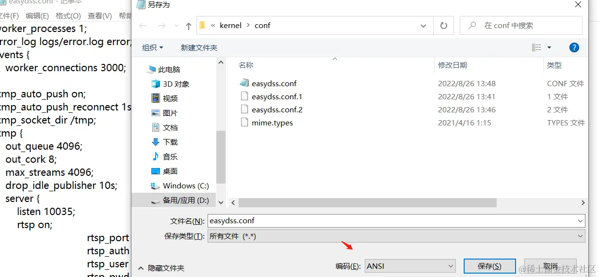 根据报错信息,进入软件EasyDSS-windows-3.2.4-21060917\kernel\conf目录,找到easydss.conf配置文件,使用记事本打开,点击“另存为”,编码选择ANSI,然后保存。