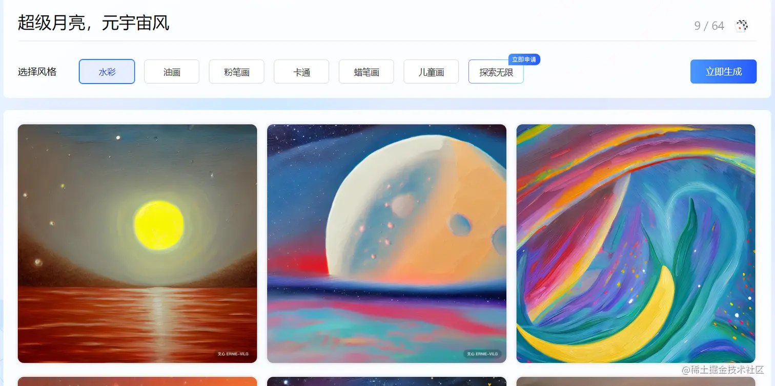 ERNIE-ViLG文生图系列服务,可以体验通过文本描述来生成相应图片的能力。可以生成水彩,油画,粉笔画,卡通,蜡笔画,儿童画等不同类型的画作/图片