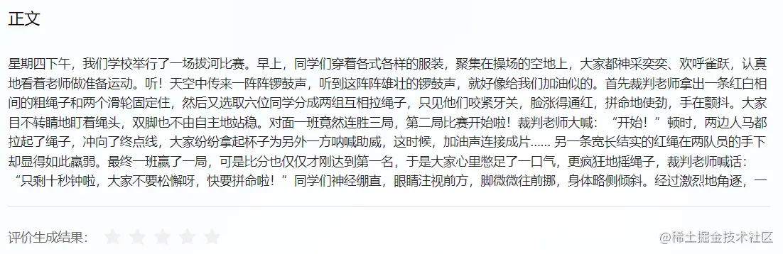 "text": "作文题目:拔河比赛\n正文:", # 题目/内容