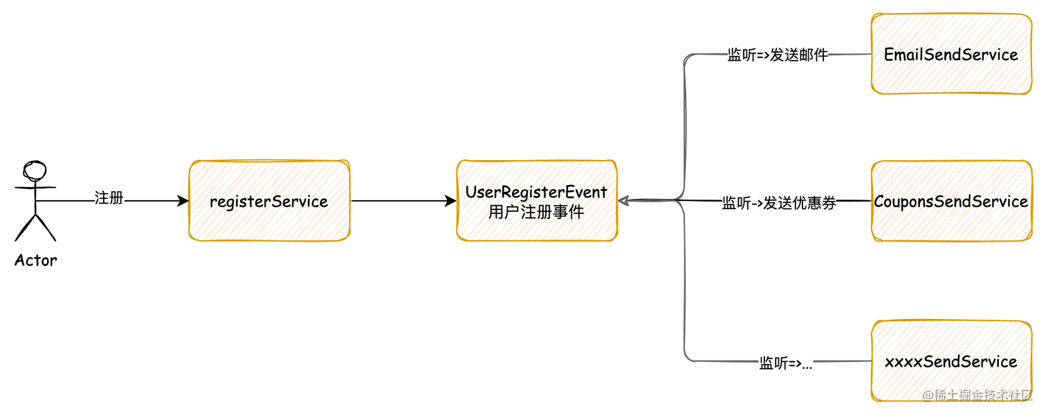 - registerService在完成自身的用户注册逻辑之后,只需要发送一个userRegisterEvent事件,无需再关注其他拓展逻辑。