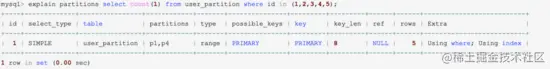 用户的SQL语句是需要针对分区表做优化,SQL条件中要带上分区条件的列,从而使查询定位到少量的分区上,否则就会扫描全部分区,可以通过 EXPLAIN PARTITIONS 来查看某条SQL语句会落在那些分区上,从而进行SQL优化,如下图5条记录落在两个分区上: