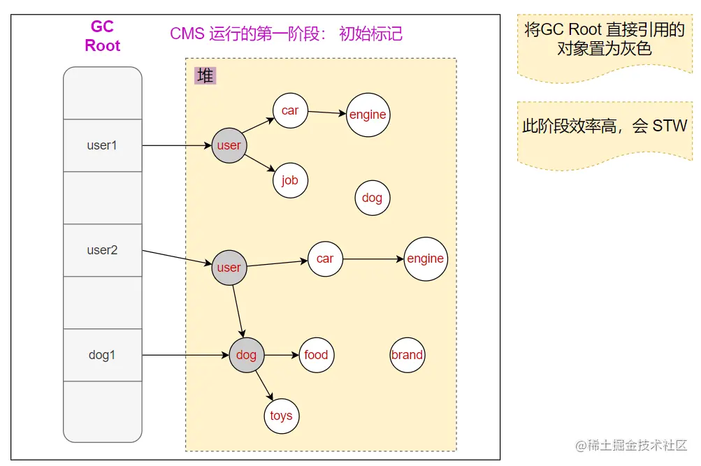 - 初始标记: 暂停用户线程,标记GC Root 直接引用 的对象,速度很快