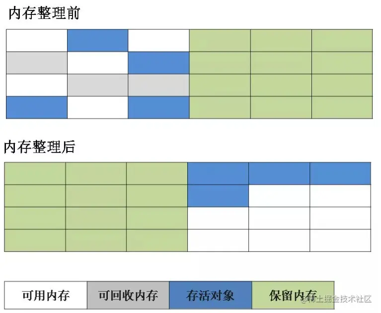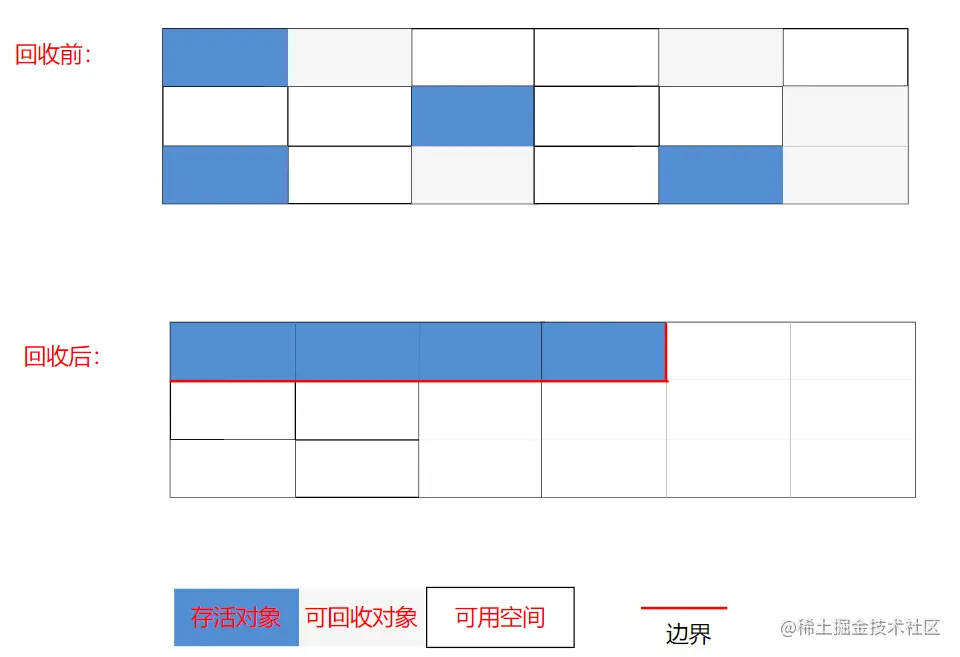 根据老年代的特点专门制定的清除方案,与标记清除一样,需要先标记存活对象,不同的是,后续没有直接回收垃圾,而是将存活的对象统一向一端移动,然后清理掉边界以外的内存
