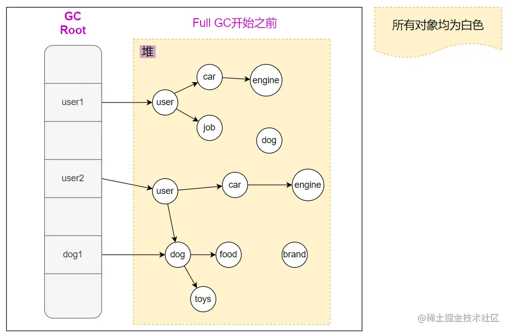 - 清理没有被标记的对象 一般选择这种,也可以反过来,标记需要回收的对象,然后清理所有被标记的对象
