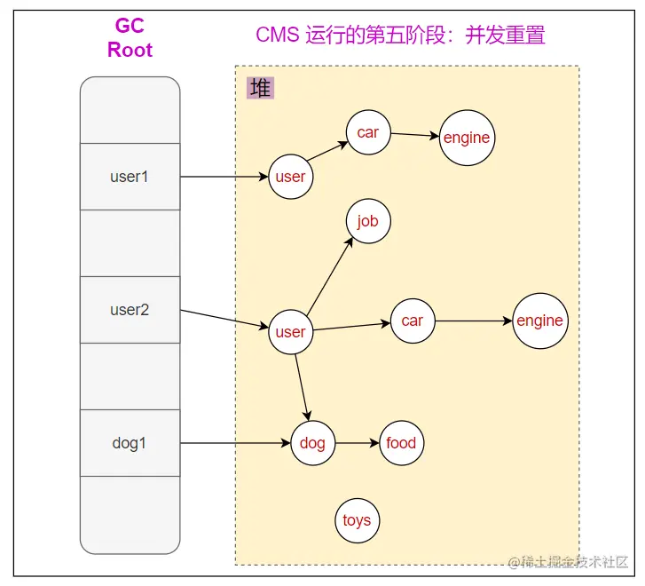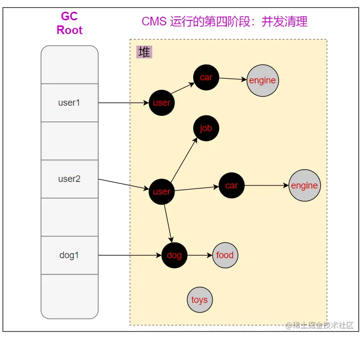 - 并发清理: 清理线程与用户线程同时运行,清理掉没有标记的对象,如果此时有新增的对象虽然没有被标记,统一会当作存活对象,不会误清理