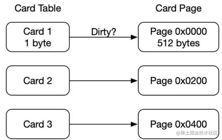 一个卡页中可包含多个对象,只要有一个对象的字段存在跨代指针,其对应的卡表的元素标识就变成1,表示该元素变脏,否则为0.