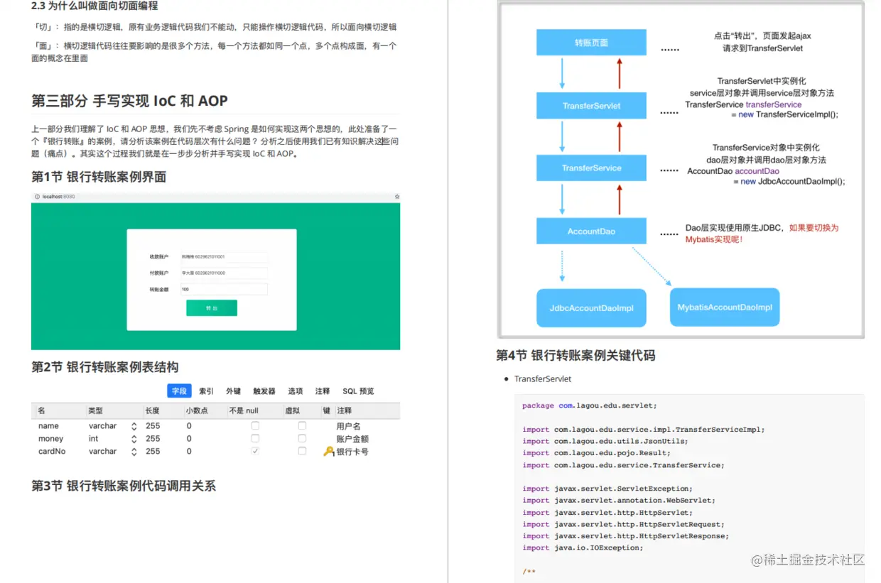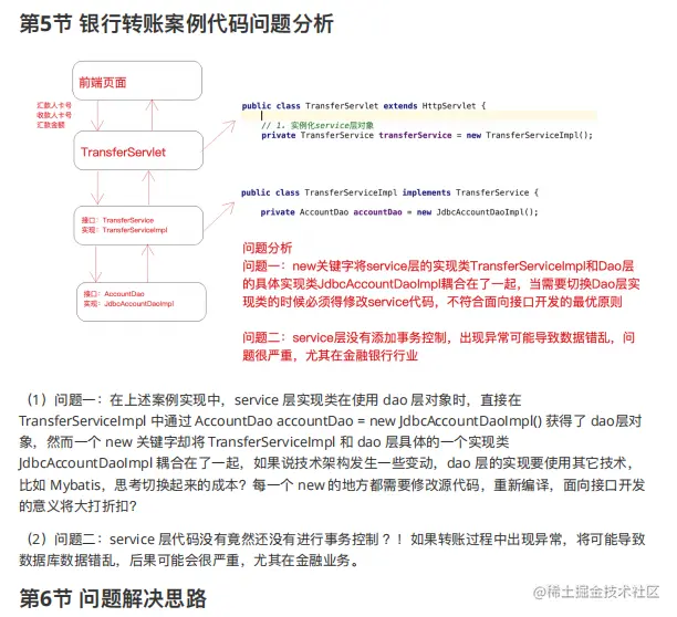 上个部分我们理解了IoC和AOP思想,我们先不考虑Spring是如何实现这两个思想的,此处准备了一个【银行转账】的案例,请分析该案例在代码层次有什么问题 ?分析之后使用我们已有知识解决这些问题(痛点)。其实这个过程我们就是在一步步分析并手写实现 IoC和AOP。
