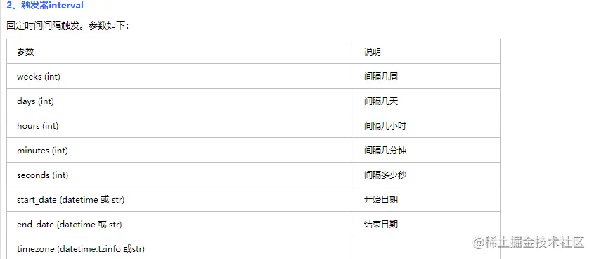 4、调度器 schedulers: 把上方三个组件作为参数,通过创建调度器实例来运行根据开发需求选择相应的组件,下面是不同的调度器组件:BlockingScheduler 阻塞式调度器:适用于只跑调度器的程序。BackgroundScheduler 后台调度器:适用于非阻塞的情况,调度器会在后台独立运行。AsyncIOScheduler AsyncIO 调度器,适用于应用使用 AsnycIO 的情况。GeventScheduler Gevent 调度器,适用于应用通过 Gevent 的情况。TornadoScheduler Tornado 调度器,适用于构建 Tornado 应用。TwistedScheduler Twisted 调度器,适用于构建 Twisted 应用。QtScheduler Qt 调度器,适用于构建 Qt 应用。