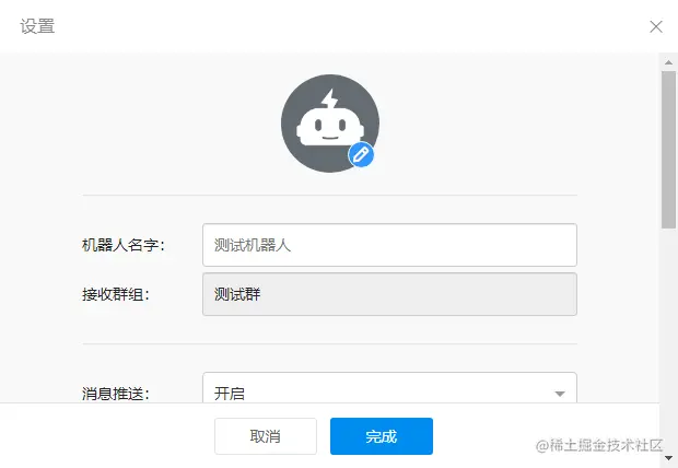 完成必要的安全设置,勾选我已阅读并同意《自定义机器人服务及免责条款》,然后单击完成。