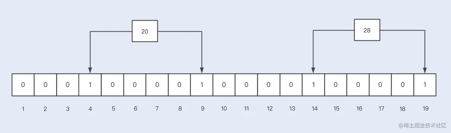 假设我们插入两个key值分别为20,28的元素,通过两次哈希函数取模后的值分别为4,9以及14,19,因此4,9以及14,19都被设置为1。
