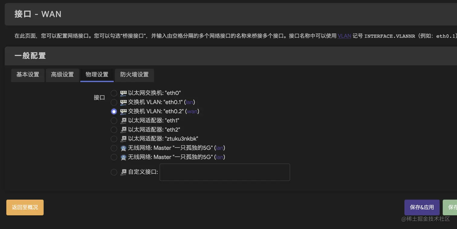 光猫改为桥接后,在路由器中,找到网络-接口,设置wan接口,