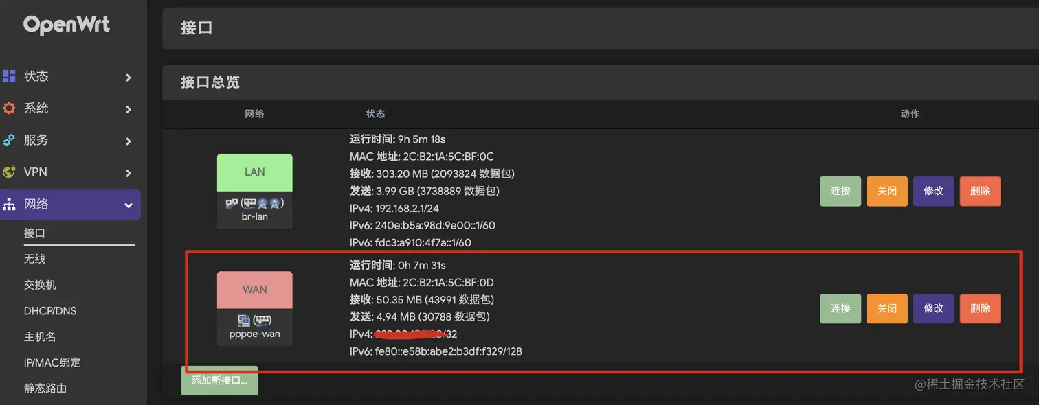 设置完成后,点击保存应用就实现了路由器拨号。拨号成功后,就可以接口那个界面看到pppoe端口的IPv4地址,就是公网IP的地址了。