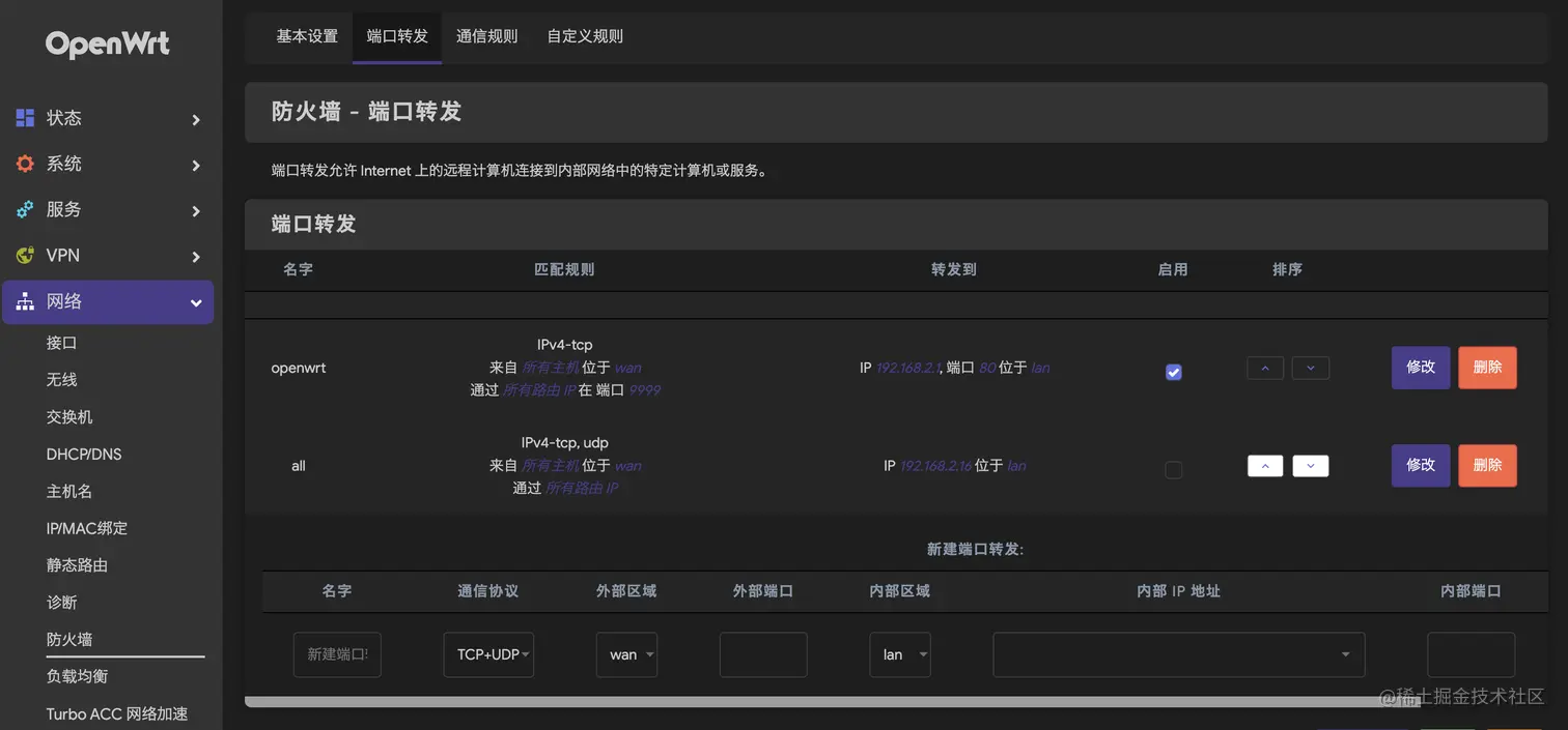 在网络-防火墙-端口转发中设置需要转发的端口,这里因为我的群晖内网地址是192.168.2.16,路由器的内网地址是192.168.2.1,这里转发了所有群晖里面的端口,以及9999到路由器的端口