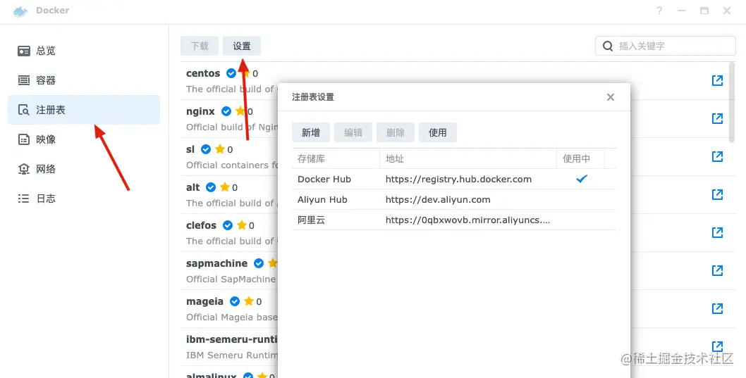 打开Docker套件,点击注册表,在弹框中新增对应的Docker源即可,具体有哪些源可以设置,大家可以自行百度即可。