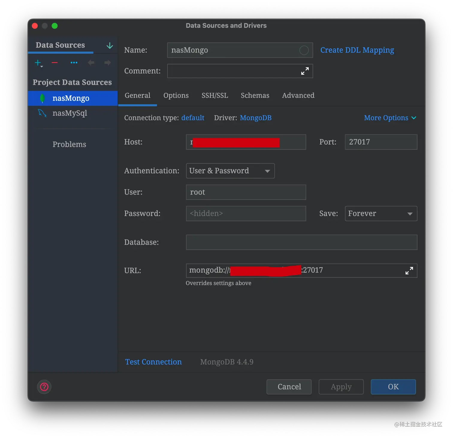 mongodb、mysql数据库服务,在注册表直接搜下载即可。群晖本身也提供了MariaDB以及phpMyAdmin,但是有时候不太满足,因此我自己又装了这两个服务,具体配置方式如下,值得注意的是最新版的mongodb安装比较麻烦,我安装的是v4.4.9:mysql安装、mongodb安装,连接方式因为我上面设置了远程访问因此可以在Webstorm中直接连接
