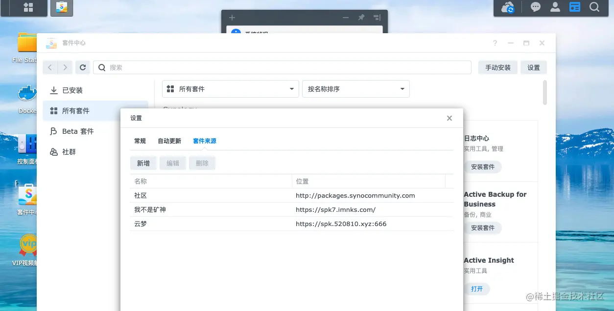 打开群晖的套件中心,点击右上角设置-套件来源,配置对应的套件源地址即可。上面三位已经为大家提供了丰富的套件,直接使用即可。另外,群晖本身其实也提供了很多好用的套件。下面主要分享一下我日常使用的套件。