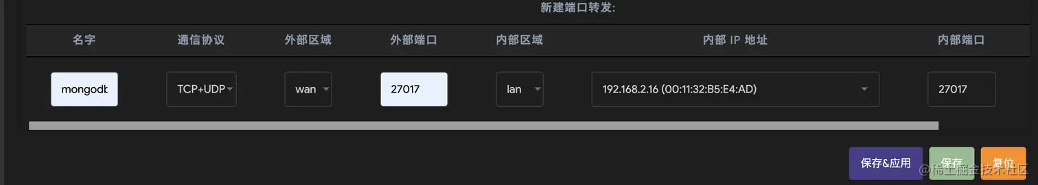 当然也可以根据实际需要,并不是所有的端口都要转发,根据需要添加即可,比如只转发mongodb的端口: