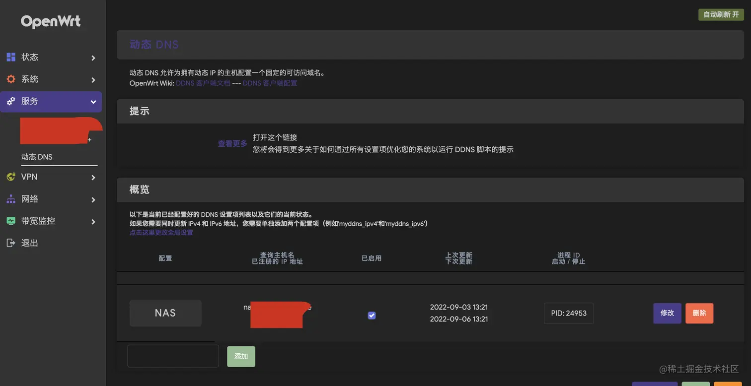找到服务-动态DNS,这里我已经添加过了,如果需要新添加则在下面新加一项即可。需要注意的时候,添加域名的过程是需要获取对应的域名提供商提供的accessKey的,这里我用的是阿里云的域名。
