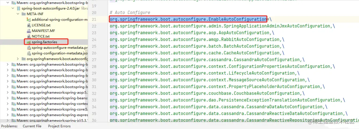这里面再继续点击去就没必要了,看错误提示大概就知道了,loadFactoryNames 方法会去 META-INF/spring.factories 文件中根据 EnableAutoConfiguration 的全限定类名获取到我们需要导入的类,而 EnableAutoConfiguration 类的全限定类名为
