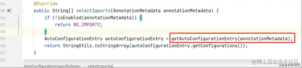 进入这个类之后,有一个方法,这个方法很好理解,首先就是看一下 AnnotationMetadata(注解的元信息),有没有数据,没有就说明没导入直接返回一个空数组,否则就调用 getAutoConfigurationEntry 方法: