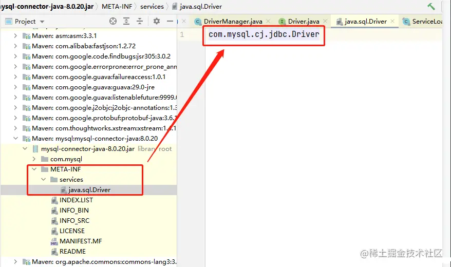 这个变量在下面加载驱动的时候有用到,下图中的 service 即 java.sql.Driver: