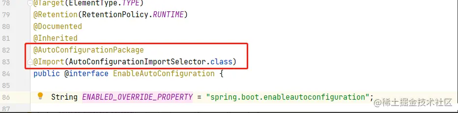 这个注解才是实现自动装配的关键,点进去之后发现,它是一个由 @AutoConfigurationPackage 和 @Import 注解组成的复合注解。