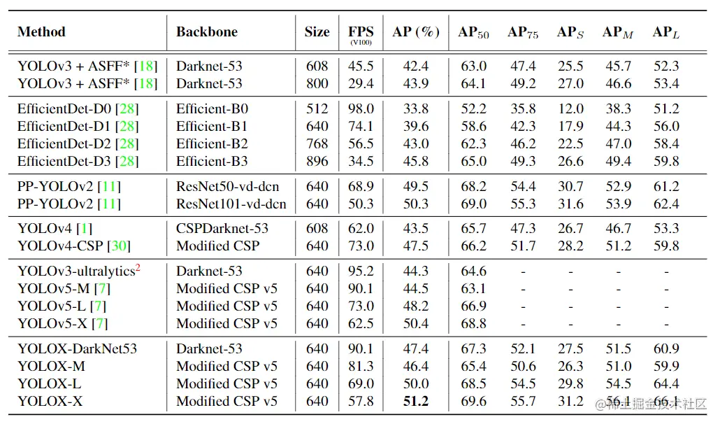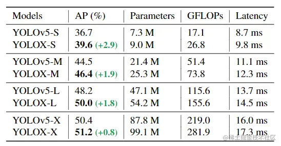 Modified CSPNet in YOLOv5 为了进行公平的比较,作者采用了原生的 YOLOv5 的 backbone,包括修改的 CSPNet、SiLU 激活 以及 PAN头,并遵循它的缩放规则去生成 YOLOX-S、YOLOX-M、YOLOX-L 和 YOLOX-X 模型。与下表中的 YOLOv5 相比,本文的模型获得了 ~3.0% 到 ~1.0% AP 的提升,同时只增加一点点时间 (来自 解耦头)。