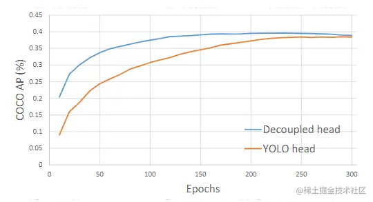 作者的两个分析实验表明,耦合的检测头可能会损害性能。(1) 如下图,将 YOLO 的头部替换为解耦头,可以大大提高收敛速度; (2) 解耦头对于端到端版本的 YOLO 至关重要,end-to-end YOLO 耦合头的 AP 降低了 4.2%,而 end-to-end YOLO 解耦头的 AP 只下降了 0.8%。作者将 YOLO 检测头替换为上图的简化解耦头。具体来说,它包含了一个 1x1 conv层以降低通道维度,其次是两个并行的分支,分别有两个 3x3 conv层。