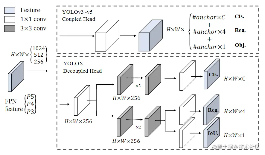 Decoupled head 在目标检测中,分类任务和回归任务之间的冲突是一个众所周知的问题。因此,用于分类和定位的解耦头被广泛应用于大多数 one-stage 和 two-stage 检测器中。然而,虽然 YOLO 系列的 backbone 和 特征金字塔 在不断演化,它们的检测头仍然是耦合的,如下图所示: