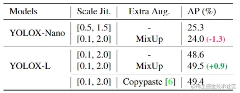 Model size and data augmentation 在实验中,所有的模型都保持了几乎相同的 学习调度策略 和 优化参数。然而,作者发现合适的增强策略 在不同规模的模型中有所不同。如下表所示,对于 YOLOX-L,应用 MixUp 可以提高 0.9% 的 AP,但对于 YOLOX-Nano 这样的小模型,数据增强的效果却是减弱的。这样的改进使 YOLOX-Nano 的 AP 从 24.0% 提高到 25.3%。