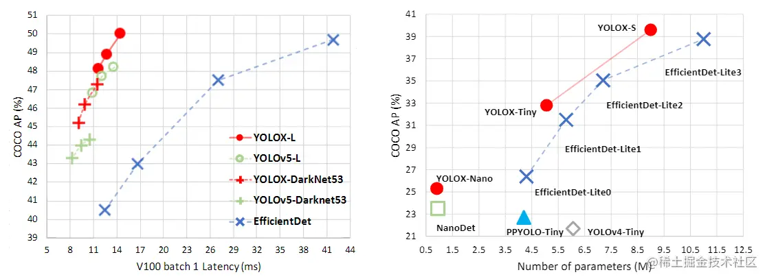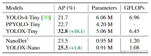 Tiny and Nano detectors 作者进一步缩小模型为 YOLOX-Tiny,以便与 YOLOv4-Tiny 进行比较。对于移动设备,采用深度卷积的方法构建了一个只有 0.91M参数 和 1.08G FLOPs 的 YOLOX-Nano 模型。如下表所示,YOLOX 在模型尺寸更小的情况下也比同类模型表现更加好。