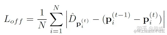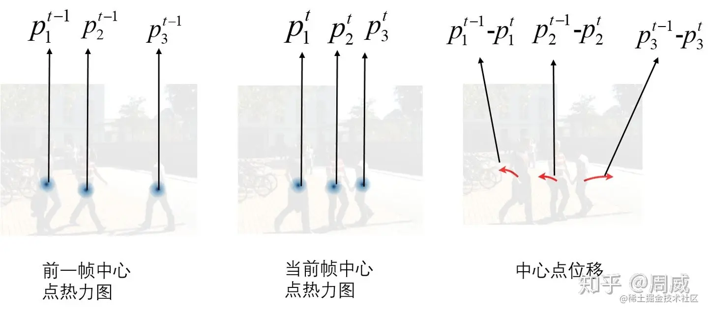 这里我们不妨更加详细地进行说明,在原图的基础上添加了一些符号。作者令物体i中心点的位移为时刻t-1中心点的位置 pit−1 与时刻t中心点的位置 pit 的变化, 也就是如下表达式