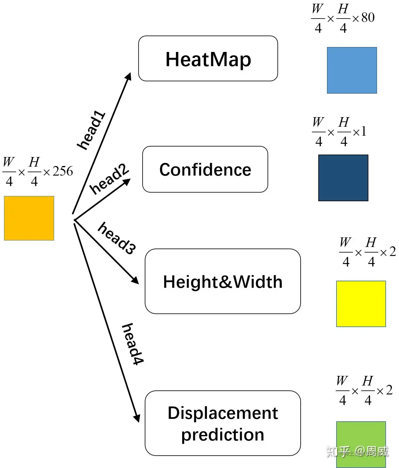- (4)Displacement prediction, 大小为(W/4,H/4,2),检测框中心点在前后帧的位移(有点类似于光流)