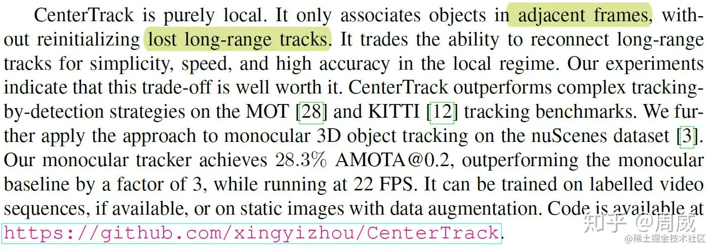 聪明的读者肯定已经发现了,这个CenterTrack只关联连续两帧之间的检测框,那么很难形成长期的关联和依赖,这样其实非常容易产生ID切换等情况的发生。但是作者论文中提到,