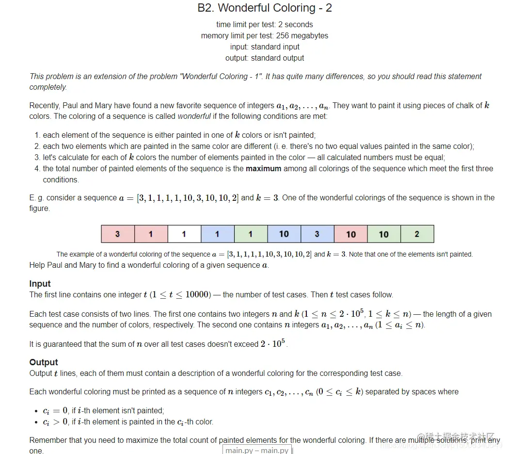 和上一题类似 1,先找到出现次数大于等于k的字母:这些字母能被染成k种颜色,多余的染不了; 2,然后把剩下的小于等于k的字母染成不同的颜色 关于第二点,要注意应该把同样的字母排在一起依次染色,否则可能让相同的字母染上相同的颜色,在这题数据量达到2e5的情况下,我采用了类似于 邻接表(数组版)的方法去实现将同种颜色的字母挨个染色的目的。